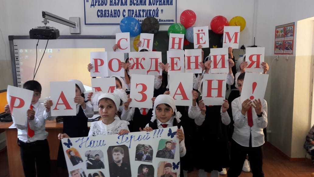05.10.201905.10.2019 года в МБОУ "Ахкинчу-Барзоевская СШ" было проведено общешкольное мероприятие посвященное ко Дню рождения Главы Чеченской Республики, Героя России Кадырова Р.А-Х.